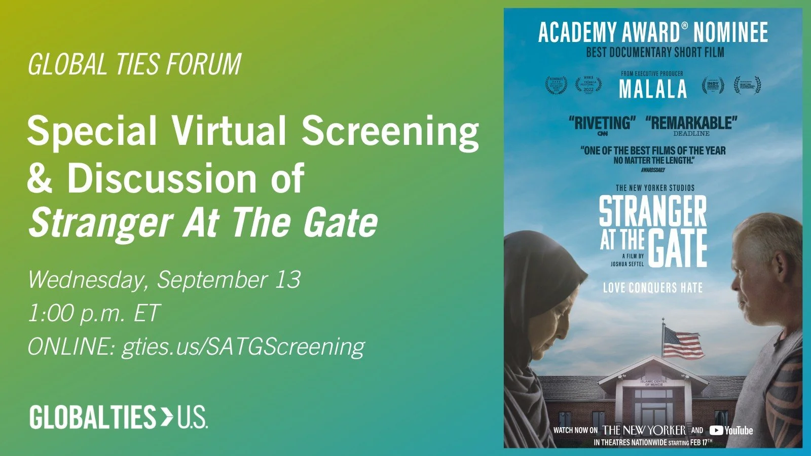 We hope you’ll join us on Wednesday for a virtual film screening and discussion of the film “Stranger at the Gate” co-hosted by the Global Ties Network and its Diversity, Equity, Inclusion, and Accessibility Working Group, of which our own Executive Director, Jodi Michaels is part.